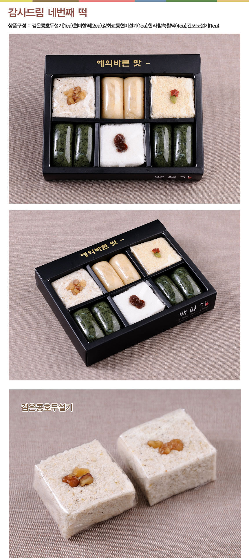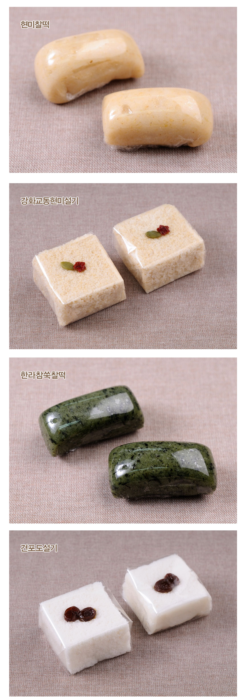 검은콩호두설기(1ea),현미찰떡(2ea),강화교동현미설기(1ea),한라참쑥찰떡(4ea),건포도설기(1ea)
